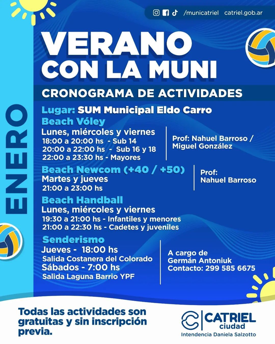Durante la temporada de verano, la Municipalidad de Catriel impulsa un completo cronograma de actividades deportivas gratuitas, pensado para promover el movimiento, la vida saludable y el encuentro comunitario.