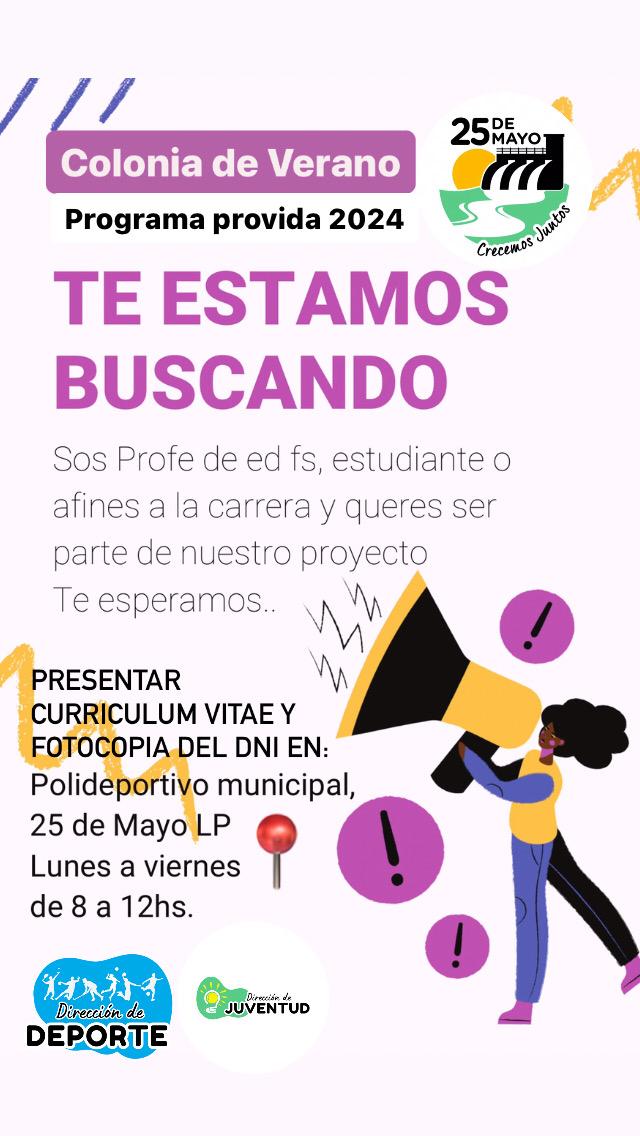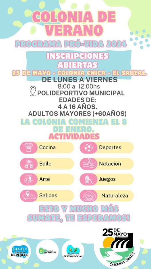 25 de Mayo-Inscripción Colonia de verano PROVIDA 2024 del lunes 18 al viernes 22 de 8 a 12hs llevar fotocopia del DNI del aspirante se les entregará la planilla en el polideportivo municipal.