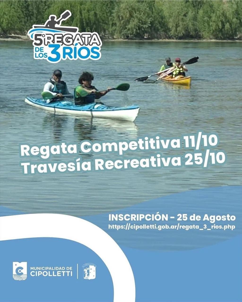 La inscripción se realiza online en cipolletti.gob.ar/regata_3_rios.php con un costo de $15.000 hasta el 7 de octubre, o $20.000 el día del evento.