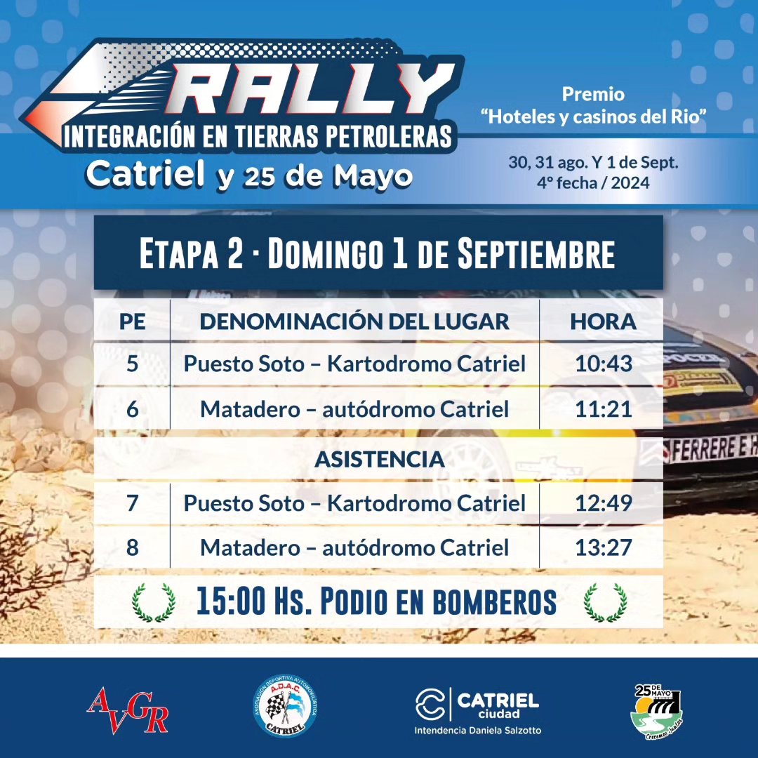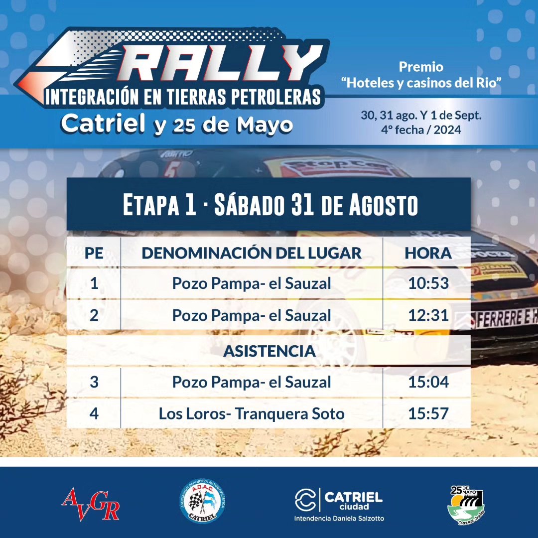 Según informaron la AVGR, ADAC y ambos municipios, la prueba se correrá el sábado en caminos pampeanos finalizando la primera etapa, compuesta por 4 pruebas de clasificación, en la zona norte de Catriel. (ver detalle)