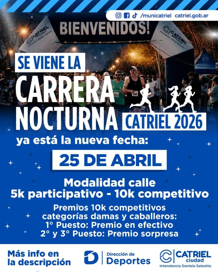 La ciudad de Catriel ya palpita una nueva edición de uno de los eventos deportivos más convocantes del calendario local. La Carrera Nocturna Catriel 2026 confirmó su nueva fecha para el sábado 25 de abril, una competencia que reunirá a corredores de la región en una jornada deportiva que combina actividad física, recreación y encuentro comunitario.
