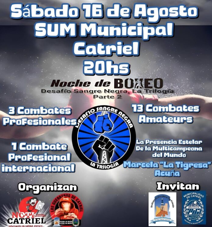 El próximo sábado 16 de agosto, el SUM Municipal de Catriel será escenario de una velada deportiva imperdible: la segunda parte del evento “Noche de Boxeo – Desafío Sangre Negra, La Trilogía”, una propuesta que promete emoción, adrenalina y combates de alto nivel.