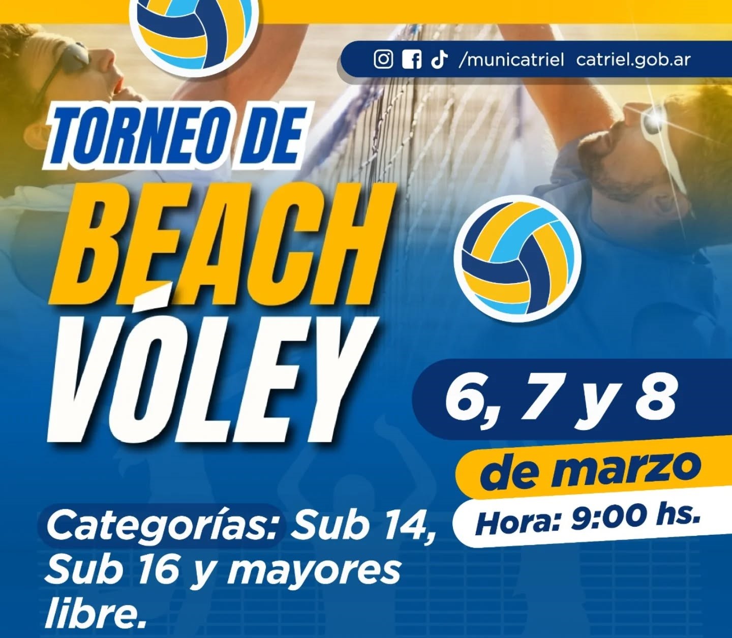 La Municipalidad de Catriel llevará adelante el Torneo de Beach Vóley, una propuesta deportiva abierta a la comunidad que se desarrollará los días 6, 7 y 8 de marzo, desde las 9:00 horas, en el SUM Municipal Eldo Carro.