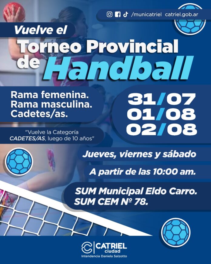 La ciudad de Catriel se prepara para recibir nuevamente el Torneo Provincial de Handball, un evento deportivo de gran relevancia que se desarrollará los días jueves 31 de julio, viernes 1 y sábado 2 de agosto, desde las 10:00 de la mañana, en dos sedes locales: el SUM Municipal Eldo Carro y el SUM del CEM Nº 78.