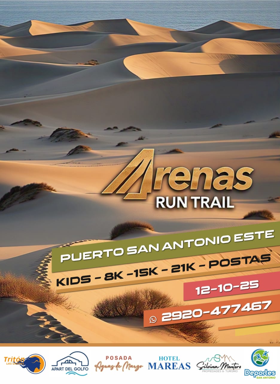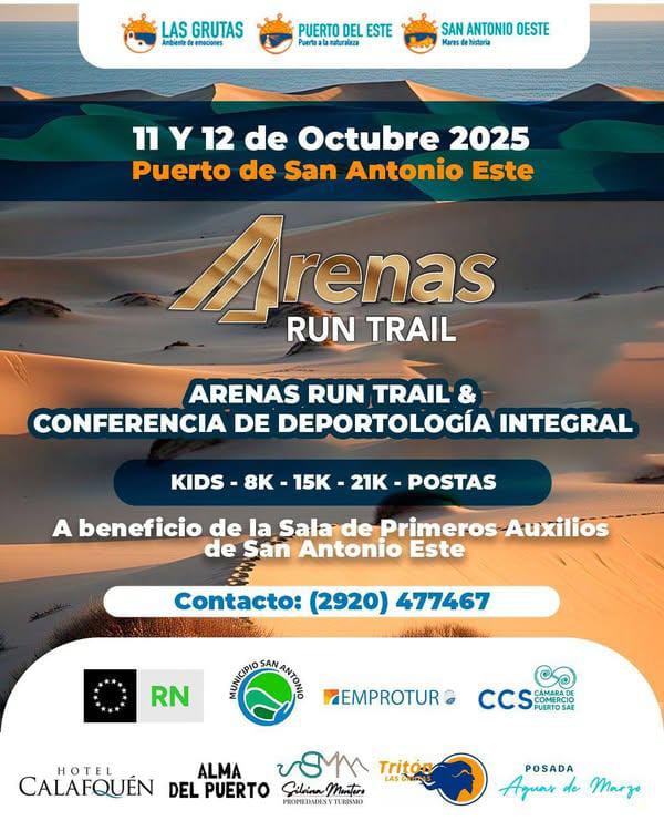 San Antonio Este, Río Negro – El próximo 12 de octubre de 2025 se celebrará la primera edición del “Arenas Run Trail”, una competencia de trail running que promete combinar deporte, naturaleza y turismo en un escenario único: los médanos y la costa marítima de la Península Villarino, en pleno corazón del Golfo San Matías.