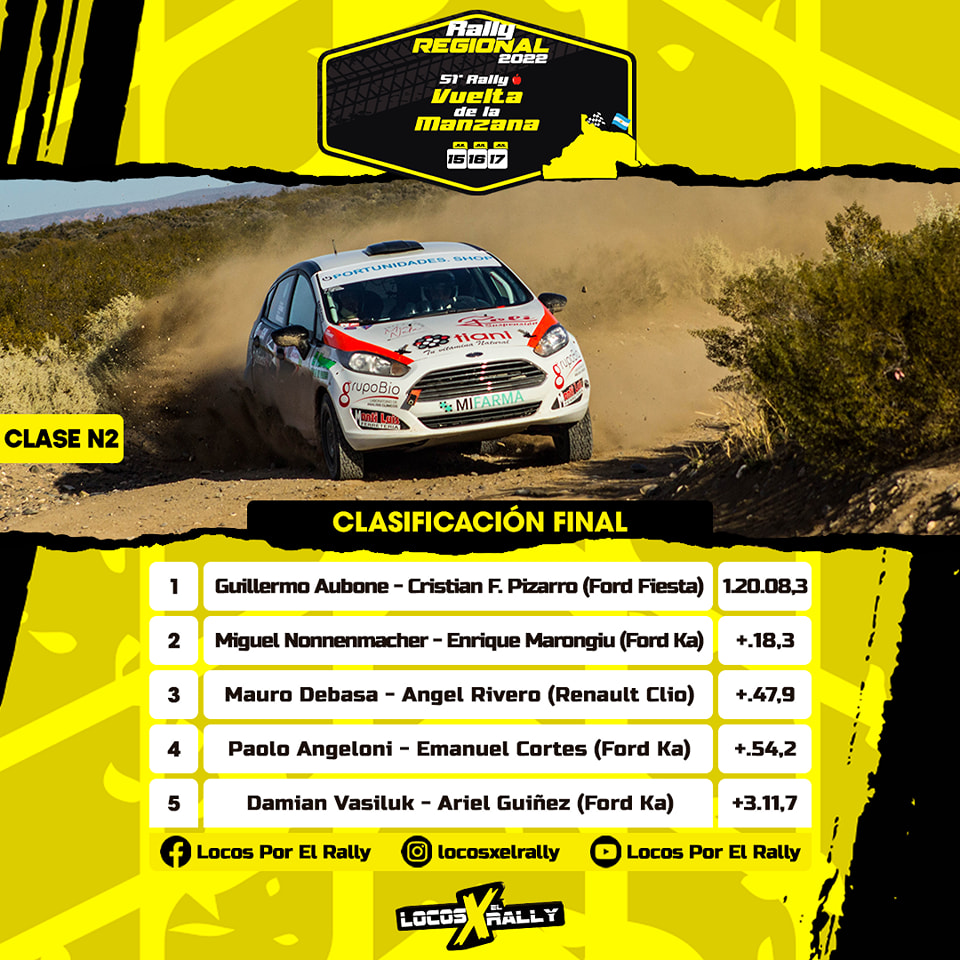 Por el lado de la N2, la categoría de mayor participaciones en esta edición, Giuliano que llegaba cómo líder del grupo sufrió un vuelco el día sábado, entregando así sus chances de hacerse por primera vez con la Vuelta de la Manzana, en tanto Mauro Debasa, junto a Rivero sufrieron problemas mecánicos desde el primer día de carrera, encarando un domingo a todo o nada a bordo de su Renault Clio del Debasa Competición, esto rindió frutos, ya que del puesto 7 el piloto Catrielense trepó hasta el podio, arribando al tercer lugar de la divisional, lo cual le permitió además relegar a Giuliano al 2° lugar de la tabla general de la N2, donde ambos pelearán hasta final de la temporada claramente por hacerse con el titulo de campeón 2022.